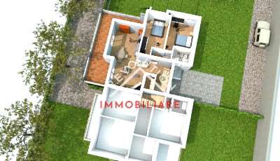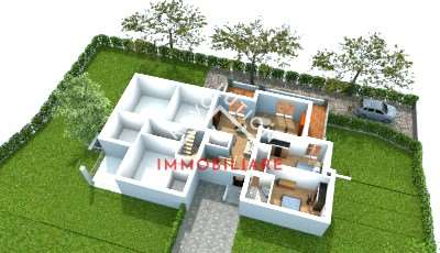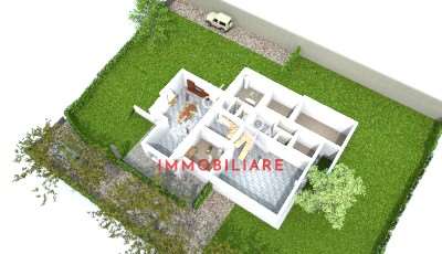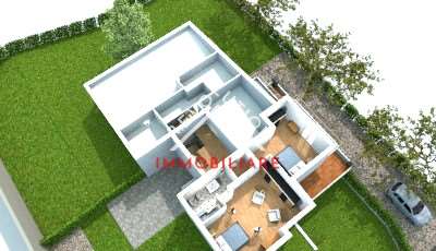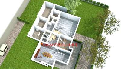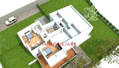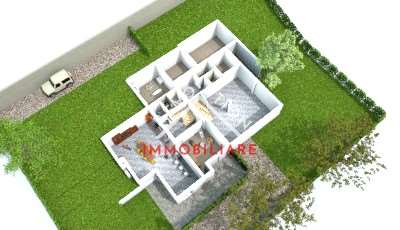 – Piano seminterrato: con ingresso dal giardino su cucina soggiorno open space, disimpegno, bagno, lavanderia, cantina e garage.