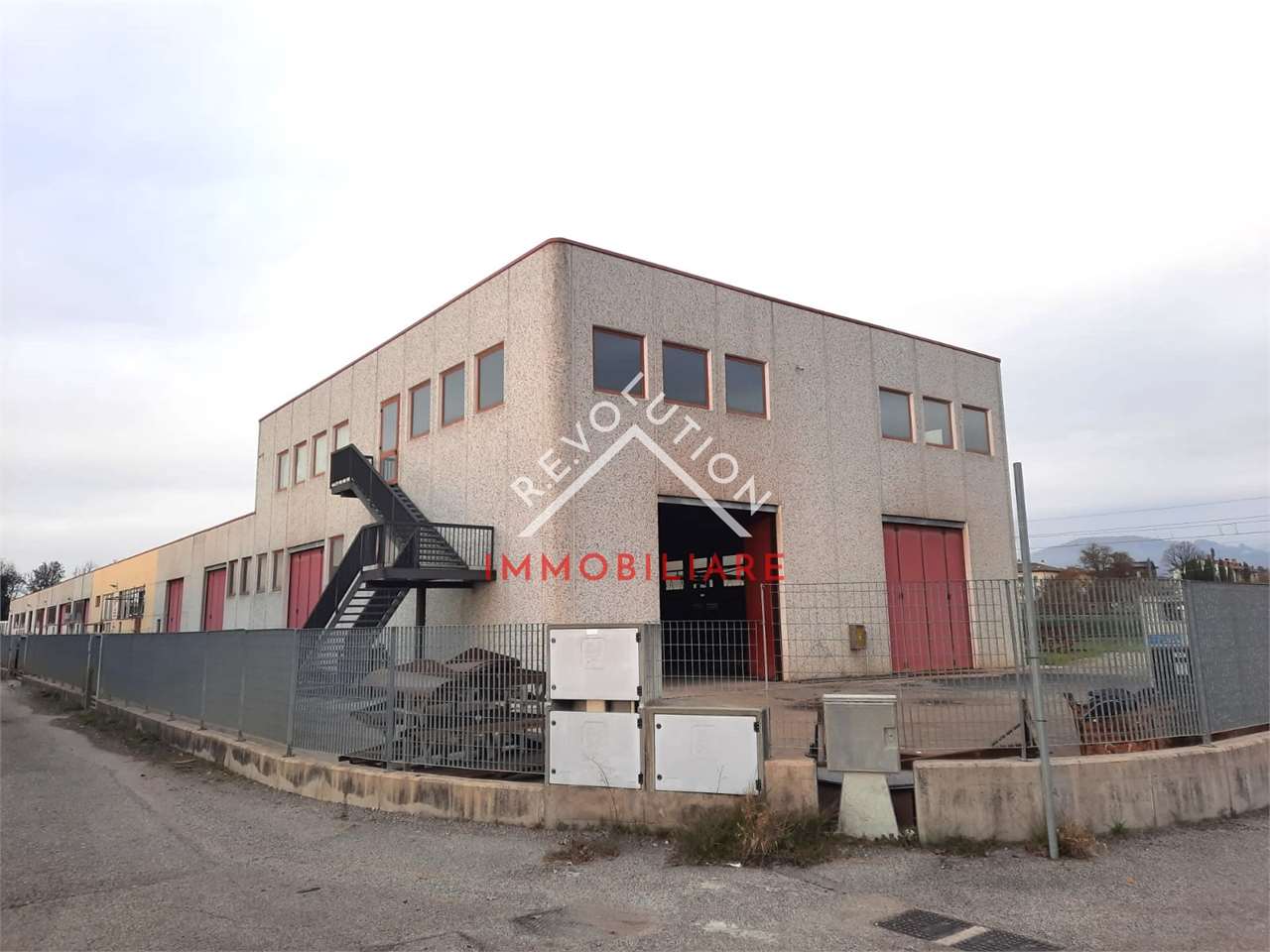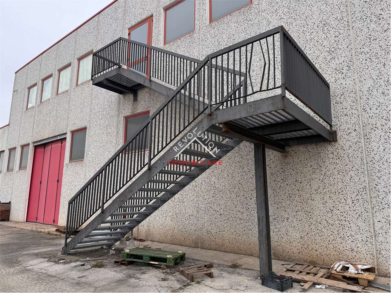 Un cancello pedonale consente l’accesso a una scala esterna in ferro, che conduce al primo piano, destinato a laboratorio.